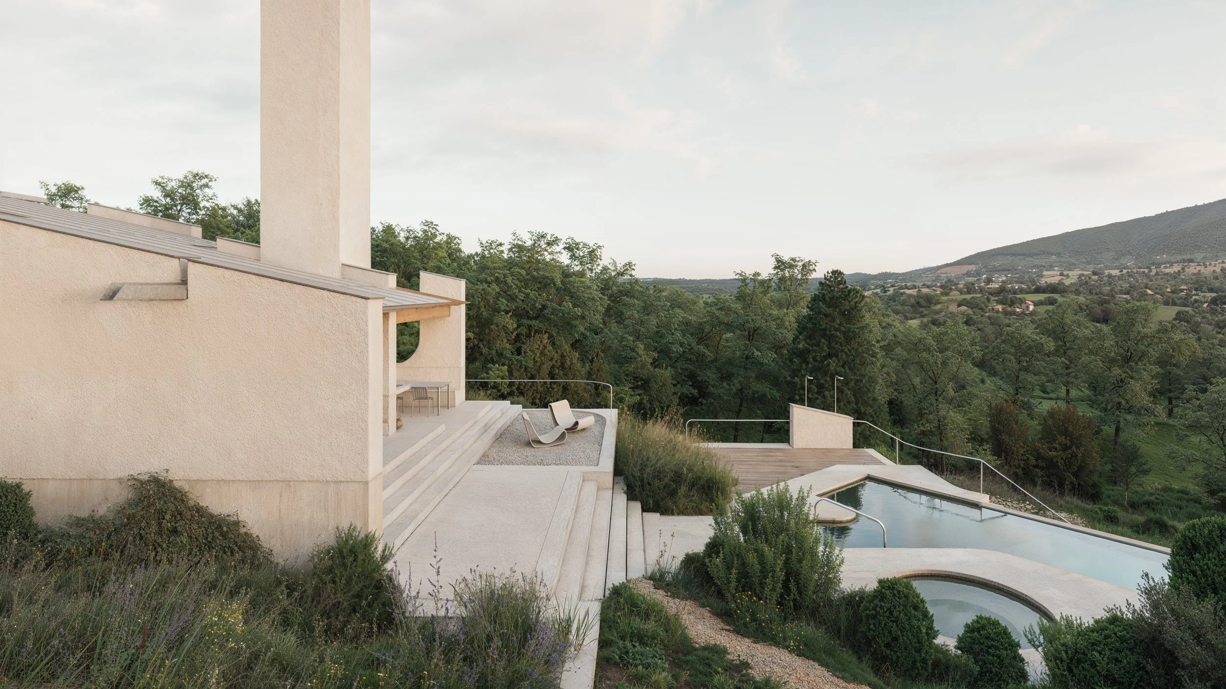 The program is distributed across several interconnected volumes, each adjusted in height and orientation to accommodate views, sunlight, and privacy. Roof planes follow the natural descent of the terrain, reinforcing the reading of the house as part of the landscape rather than an object placed upon it. Circulation is conceived as a slow progression, both inside and outside, where movement reveals changing perspectives toward the surrounding greenery and distant horizons.